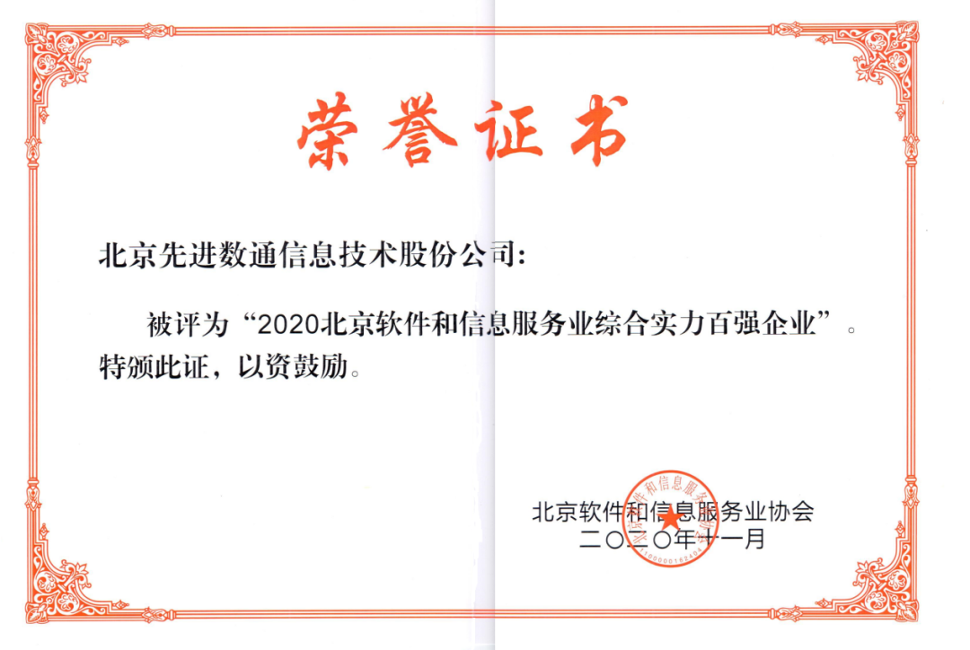 evo真人视讯成功入选“2020北京软件和信息服务业信息综合实力百强”企业,并获评2020北京软件企业核心竞争力规模型企业。